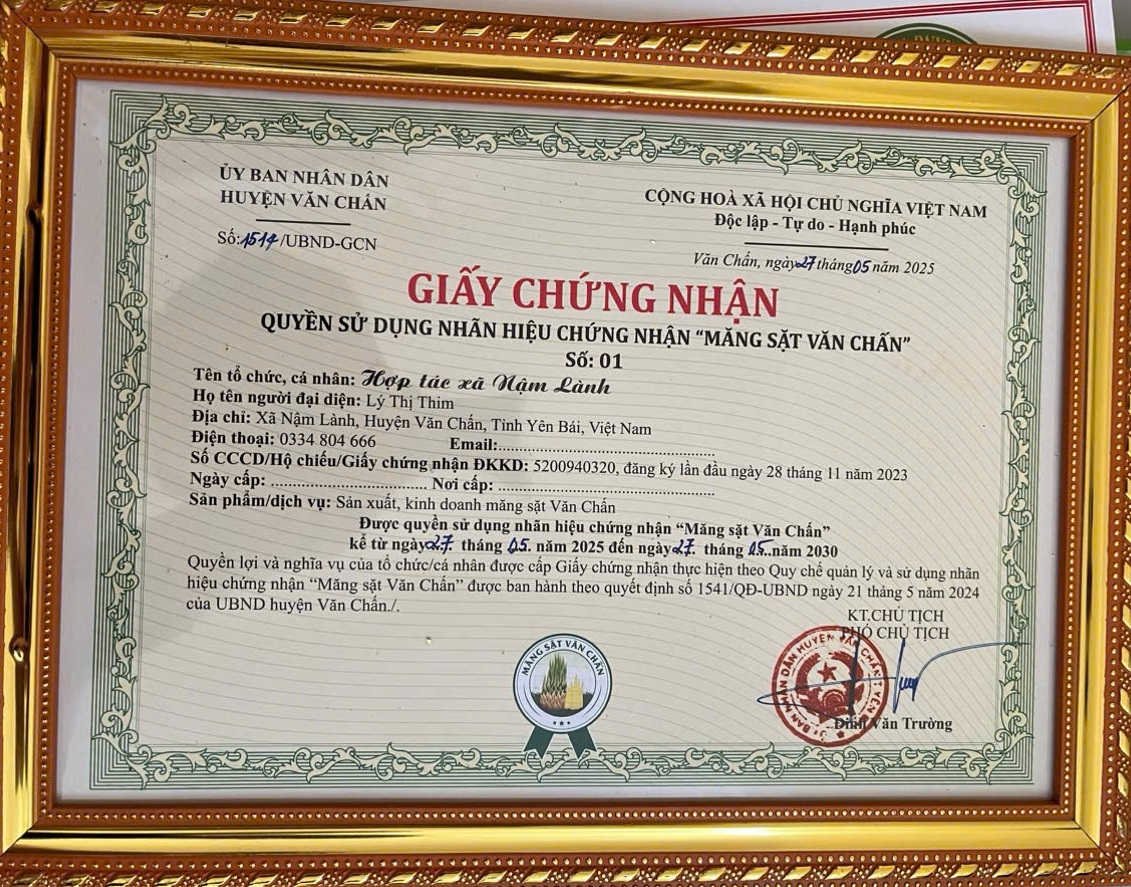 Để khai thác, phát triển NHCN “Măng sặt Văn Chấn”, ngày 29/5/2025 UBND UBND huyện Văn Chấn tổ chức Hội nghị Cấp quyền sử dụng nhãn hiệu chứng nhận "Măng sặt Văn Chấn" cho 3 chủ thể sản xuất, kinh doanh măng sặt của huyện Văn Chấn, tỉnh Yên Bái: HTX Nậm Lành; Hộ Hoàng Văn Chiêu; Hộ Hoàng Tòn Lai.